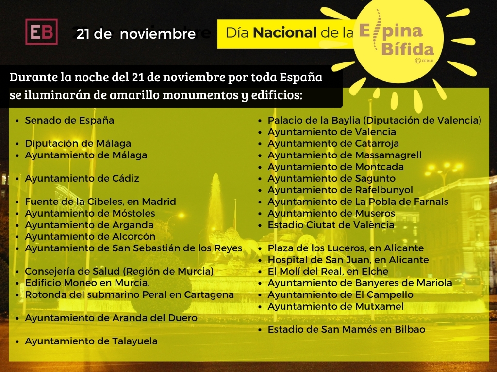 Como gesto de visibilidad, FEBHI y sus entidades han solicitado e invitado a Ayuntamientos y diversas instituciones nacionales y locales, a iluminar monumentos y edificios oficiales con luz amarilla durante la noche del 21 de noviembre. Este gesto simbólico busca concienciar y visibilizar la realidad de las personas con Espina Bífida y reivindicar su plena integración en la sociedad.